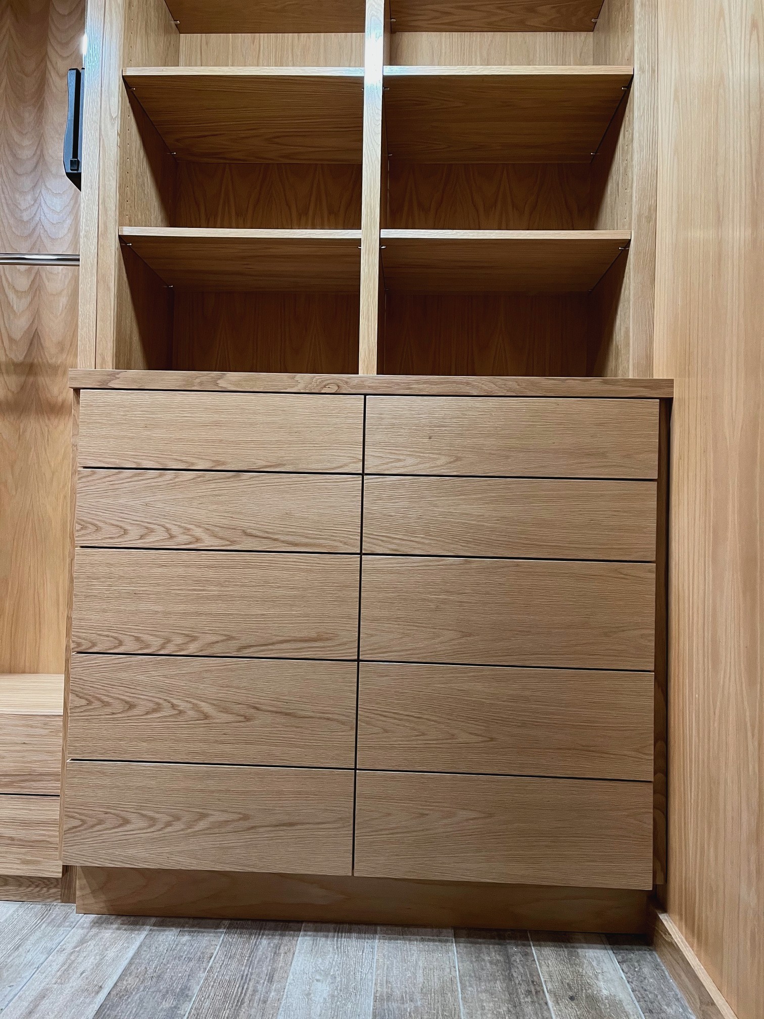 We redesigned her space with custom-built shelving, soft-close drawers, and elegant glass display cases for accessories. A combination of open and closed storage created the perfect balance between functionality and aesthetics. Integrated LED lighting illuminated the space, making it easier to find and organize essentials. A dedicated shoe wall and custom hanging sections ensured that every item had its place.